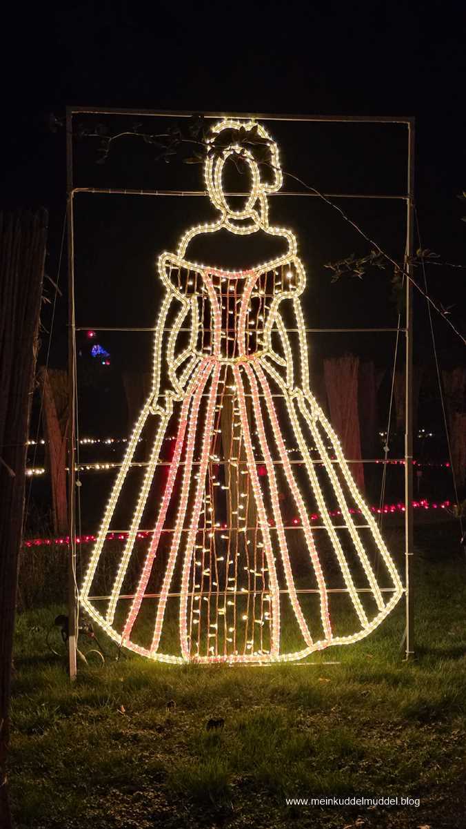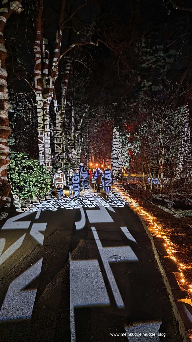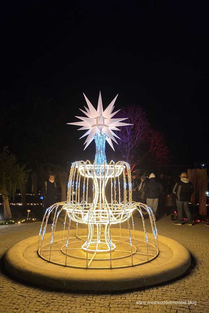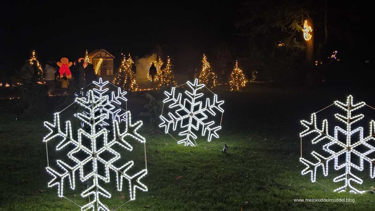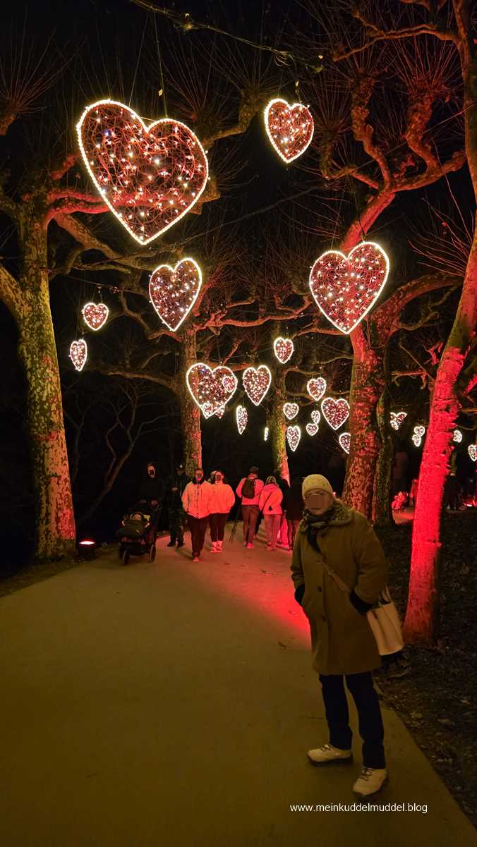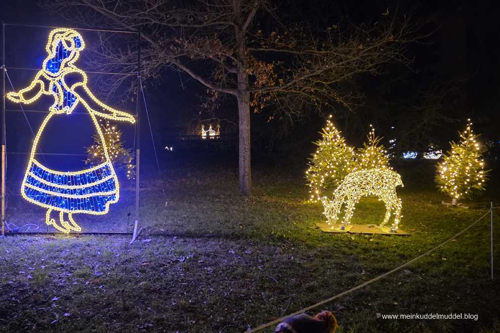 Trotz der Wetterprognose war die Insel gut besucht. Doch es gab kein Gedränge. Lediglich an den installierten Objekten für Erinnerungsfotos kam es zu Wartezeiten. Immer wieder kamen wir an Installationen vorbei, die Märchenszenen darstellten, wie „Frau Holle“, „Schneeweißchen und Rosenrot. Ihr dürft anhand der Fotos auch mal selbst raten zu welchem Märchen es passt. Dazwischen gab es fantasievolle großflächige Lichtspiele und aus dem Sommer bekannte Motive, die dann in einer Blütenpracht erblühen. Für Kinder wie Erwachsene ist es ein schönes winterliches Ausflugsziel.