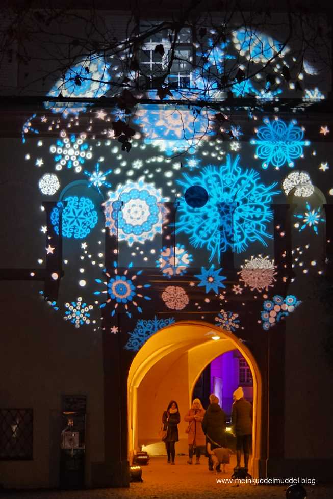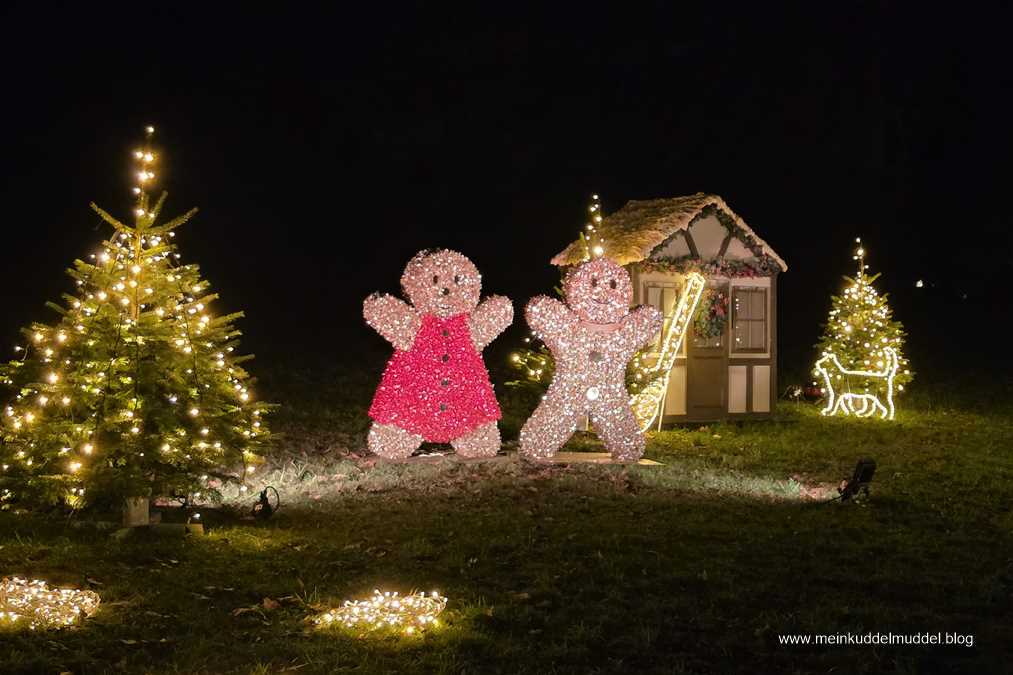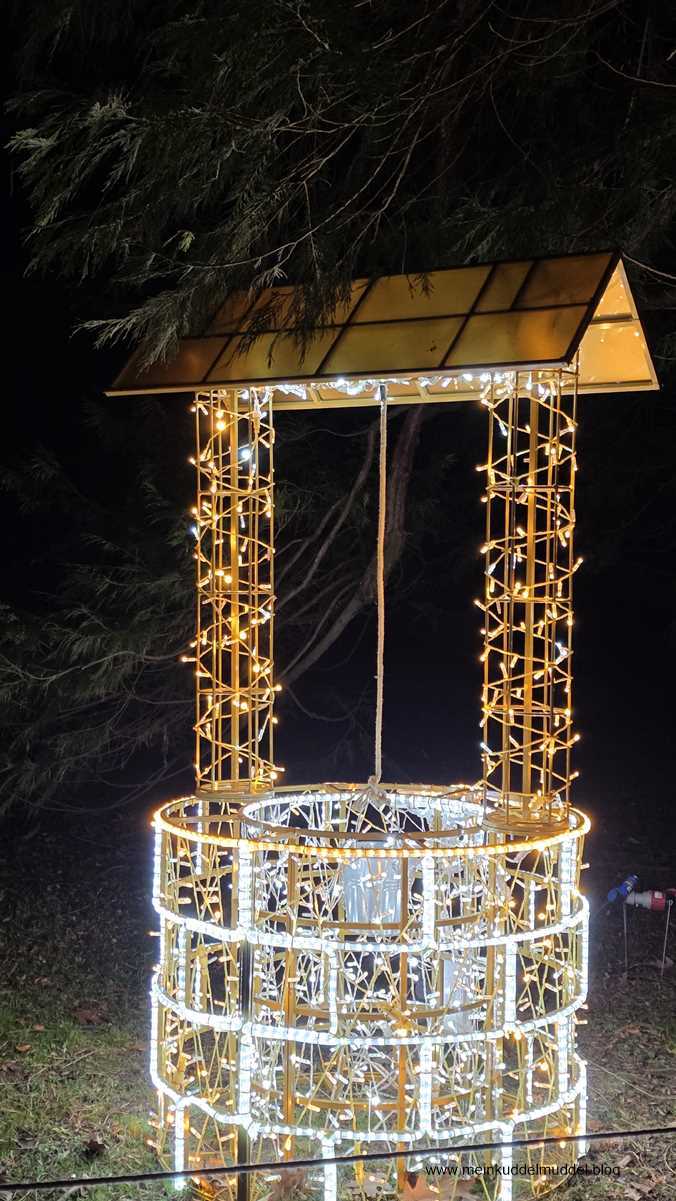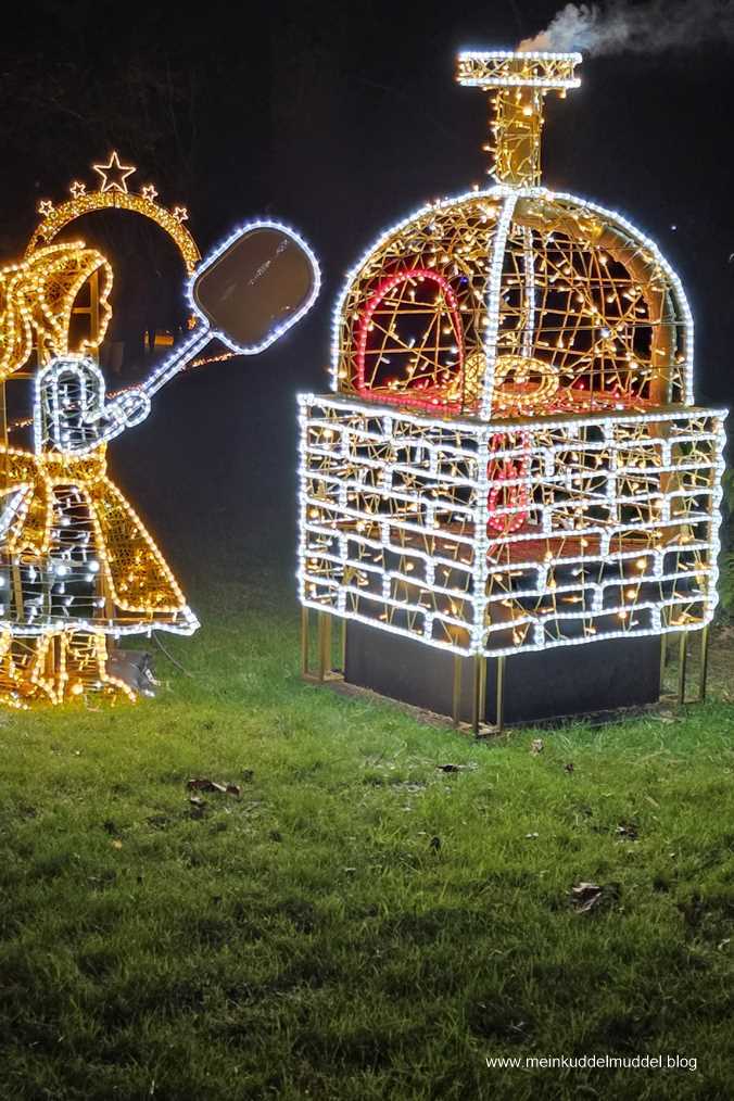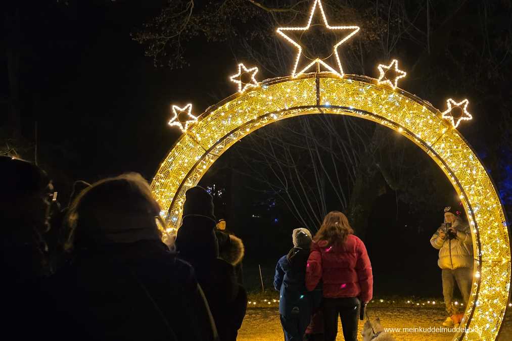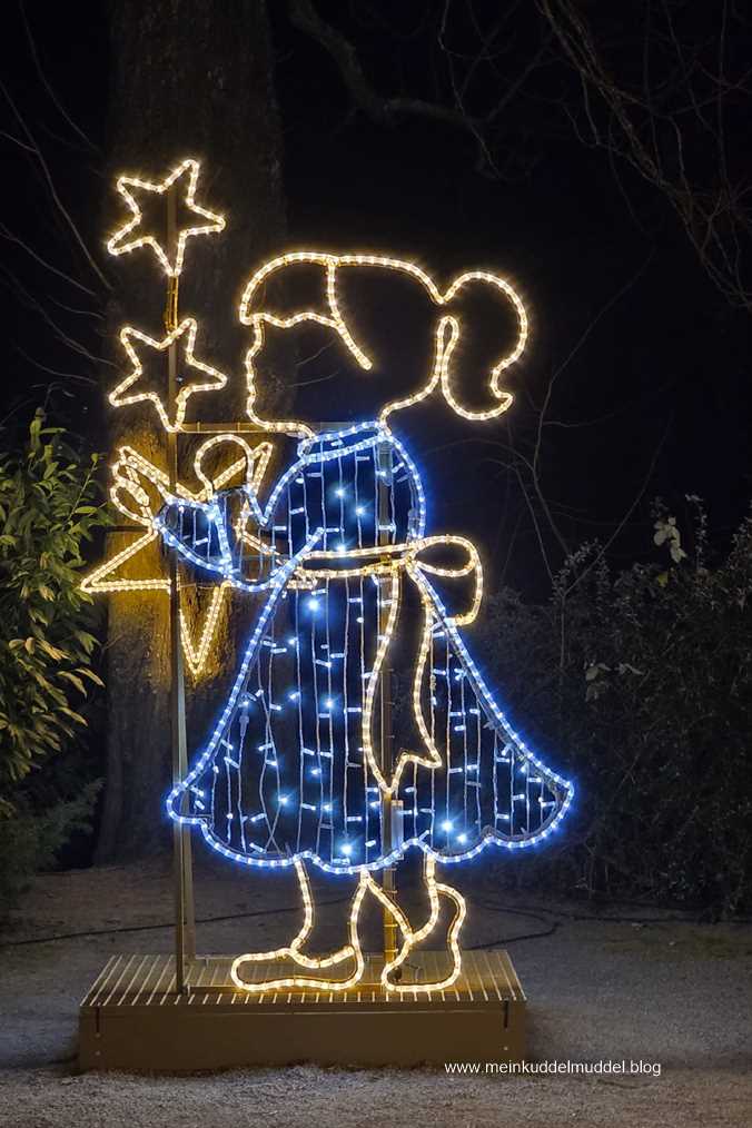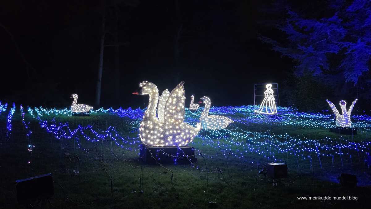 Trotz der Wetterprognose war die Insel gut besucht. Doch es gab kein Gedränge. Lediglich an den installierten Objekten für Erinnerungsfotos kam es zu Wartezeiten. Immer wieder kamen wir an Installationen vorbei, die Märchenszenen darstellten, wie „Frau Holle“, „Schneeweißchen und Rosenrot. Ihr dürft anhand der Fotos auch mal selbst raten zu welchem Märchen es passt. Dazwischen gab es fantasievolle großflächige Lichtspiele und aus dem Sommer bekannte Motive, die dann in einer Blütenpracht erblühen. Für Kinder wie Erwachsene ist es ein schönes winterliches Ausflugsziel.